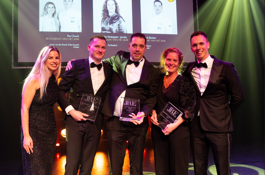 | Maandagavond tijdens een feestelijke theatershow in Hardenberg reikte JRE-Nederland de JRE Awards 2026 uit. Drie leden vielen in de prijzen die volgens de vereniging uitblinken in vakmanschap, gastvrijheid en ondernemerschap. Rick Blanken van Ledeboer (Almelo) is uitgeroepen tot Chef van het jaar, Hanneke Verstappen-Jacobs van De Beejekurf (Venray) tot Gastvrouw van het Jaar en het Restaurant van het Jaar is The Church (Arnhem) van Bart Leussink en Janiek van den Broeck. Daarnaast werden ook de nieuwe leden en het nieuwe bestuur voorgesteld. JRE-Nederland, de toonaangevende vereniging van jonge, ambitieuze restaurateurs, zette met de JRE Awards 2026 opnieuw uitzonderlijk talent en opvallend ondernemerschap in het zonnetje. Extra bijzonder is dat de winnaars worden gekozen door de leden zelf, collega’s uit het vak die als geen ander weten wat excellentie betekent. De avond stond geheel in het teken van talent, inspiratie en beleving: een sprankelend programma waarin leden, partners en gasten genoten van korte films, interviews en live muziek. Chef van het Jaar 2026 – Rick Blanken (Restaurant Ledeboer, Almelo) In het voormalige pand van de Twentse Bank runt Rick Blanken zijn Restaurant Ledeboer, een plek waar beleving en gastronomie hand in hand gaan. Zijn keuken is puur, verfijnd en vol frisse accenten. Rick begon als chef en bedrijfsleider, groeide door tot mede-eigenaar en sinds 2023 is hij volledig eigenaar van het restaurant. Met zijn team zet hij Almelo en Twente culinair op de kaart.De award werd uitgereikt door Tijn Swinkels (Royal Swinkels). Gastvrouw van het Jaar 2026 – Hanneke Verstappen–Jacobs (De Beejekurf, Venray) Met haar aandacht, persoonlijke stijl en natuurlijke flair weet Hanneke Verstappen–Jacobs van De Beejekurf elke gast zich direct thuis te laten voelen. Ze is het gezicht van het restaurant en tilt samen met haar team het restaurant naar een hoger niveau. De award werd overhandigd door Martijn Kwast (Kwast Wijnkopers). Restaurant van het Jaar 2026 – The Church (Arnhem) In de monumentale kerk in het Arnhemse modekwartier combineren Bart Leussink en Janiek van den Broeck gastronomie, sfeer en storytelling tot één bijzondere ervaring. Hun restaurant The Church verrast met eigentijdse fine dining, doordachte wijn-spijscombinaties en een decor dat elk diner onvergetelijk maakt. De award werd uitgereikt door Michelle Hartman (illycaffè). Nieuwe voorzitter en nieuwe leden Tijdens de show maakte JRE-Nederland ook het nieuwe bestuur en de leden bekend. Na zes jaar droeg Marko Karelse (Villa la Ruche, Voorburg) het voorzitterschap over aan Bjorn Massop (Restaurant Lokaal, Doetinchem). Samen met vicevoorzitter Rick Blanken (Ledeboer, Almelo) en Lino de Vrede (Au Coin des Bons Enfants, Maastricht) vormt hij het nieuwe bestuur. De nieuwe leden zijn: – Roel Sieverink & Kim Blaauw – De Ölliemölle (Borculo) – Kaj & Lissa Landman – Holsterhof (Posterholt) – Danny Meijboom & Rik Opstals – G7 (Sittard) – Yorick de Groot & Michelle Leone – Éclusier (Bloemendaal) Internationale nominaties Voor het internationale JRE Congress 2026 in Keulen zijn de volgende Nederlandse leden genomineerd: – Rick Blanken – Ledeboer (Chef of the Year) – Hanneke Verstappen–Jacobs – De Beejekurf (Hospitality Excellence Award) – Lino de Vrede – Au Coin des Bons Enfants (Sommelier of the Year) – Laurent Smallegange – Spetters (Sustainability Award) – Bart Leussink – The Church (Re·Generation Award) – Pasquale Carfora – Aroma (Taste of Origin) Met deze nominaties benadrukt JRE-Nederland opnieuw de kwaliteit en ambitie van hun leden. Over JRE–Jeunes Restaurateurs JRE–Jeunes Restaurateurs is een internationale vereniging van jonge restauranthouders en chefs die hun liefde voor gastronomie delen. Met ruim 400 restaurants in 16 landen, waaronder 41 in Nederland, draait alles om vakmanschap, creativiteit en het gebruik van lokale producten met aandacht voor duurzaamheid. Meer informatie: www.jre.nl |
